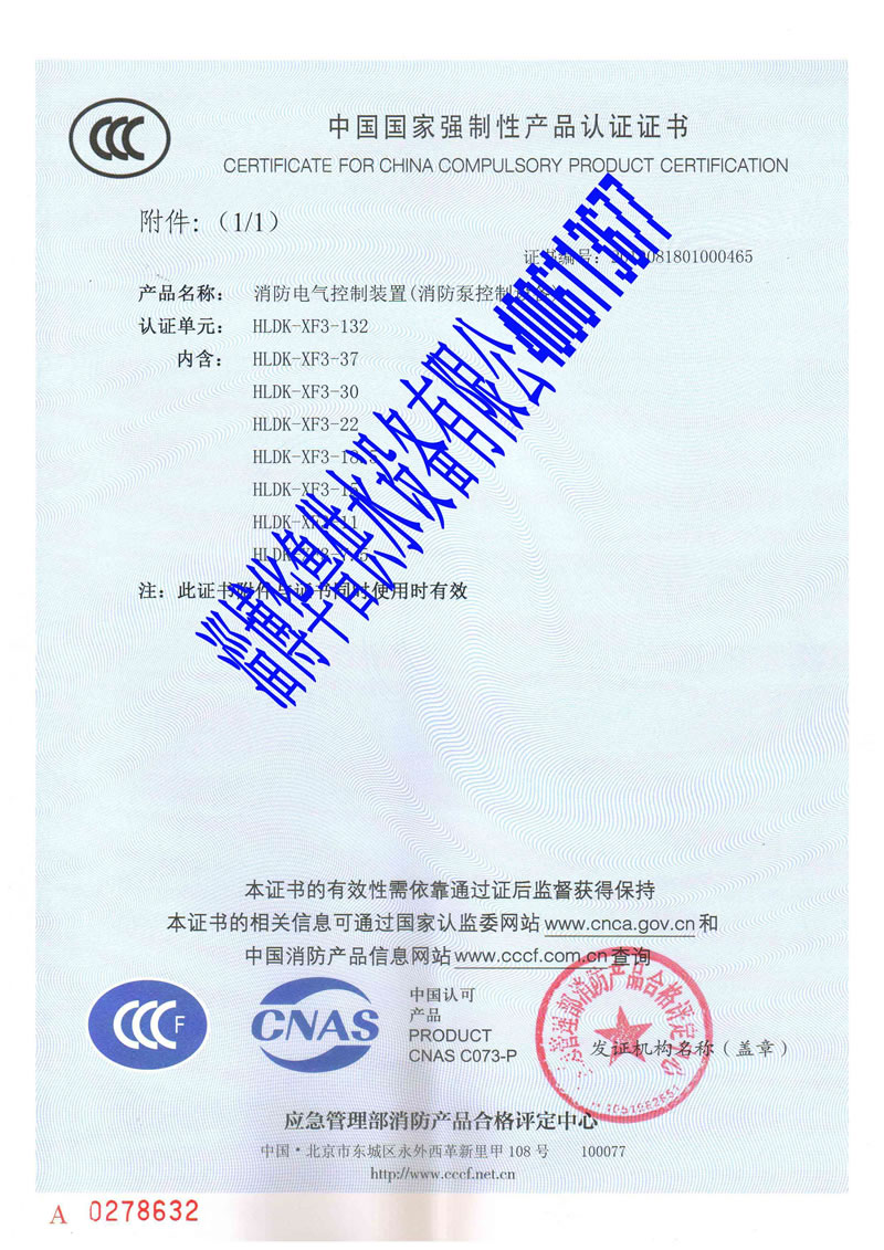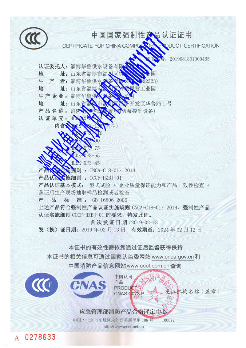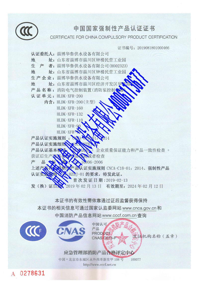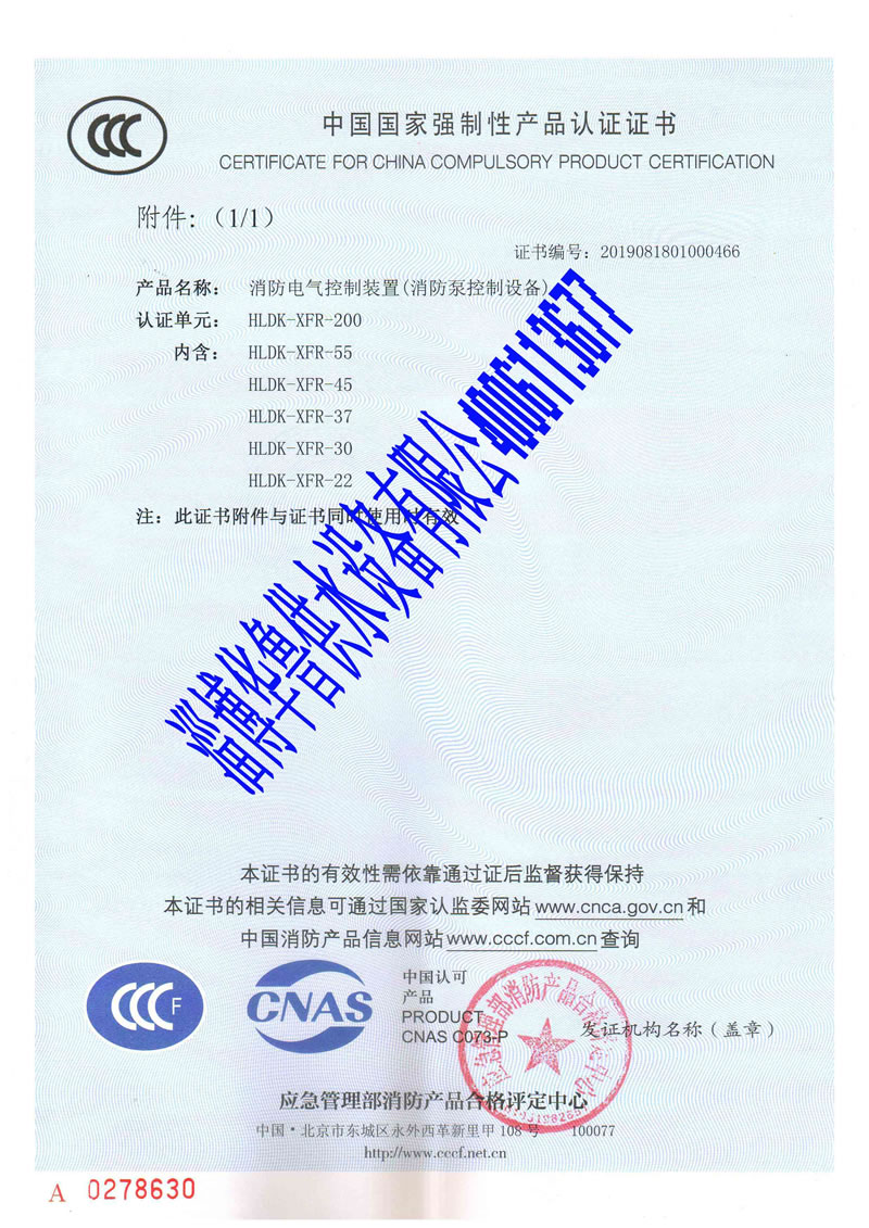 經(jīng)過(guò)沈陽(yáng)消防所的嚴格檢測,華魯供水在擁有1控2、自動(dòng)巡檢控制柜的基礎上,1控3和軟起200kw以下全系列型號的證書(shū)也下來(lái)了。淄博華魯供水公司必將秉承嚴格的生產(chǎn)及檢驗條件為廣大用戶(hù)提供優(yōu)質(zhì)的產(chǎn)品